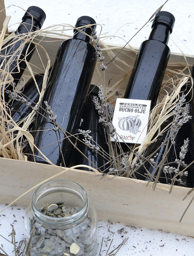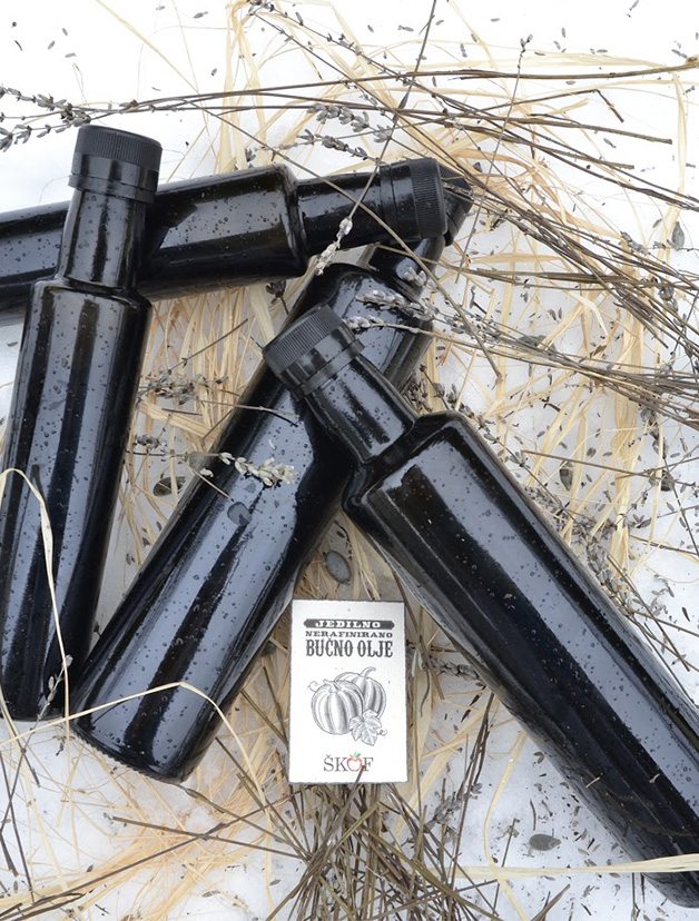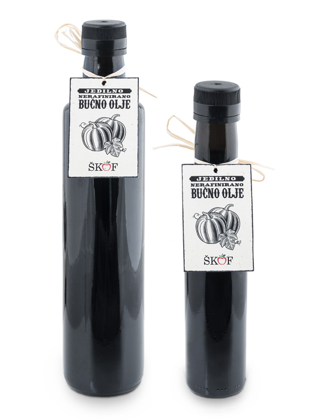 100 % jedilno nerafinirano bučno olje pripravljeno iz lastnih semen avtohtone sorte Slovenska golica. Olje je bogato z vitamini in minerali ter delta-7-steroli. Priporočamo pri pripravi solat, jedi in sladic. Pridelano po tradicionalnem postopku s toplim stiskanjem. Hranite v temnem in hladnem prostoru.